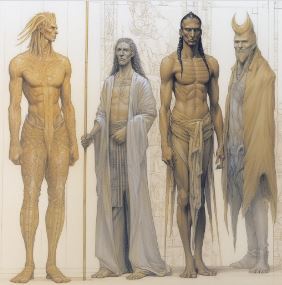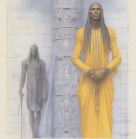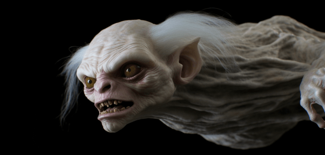 There are albino orcs who go by the name Skolleth and Skommeth (a kind of married version of Gollum and a prophetic witch from Macbeth)…there are the kind-hearted dwarflike Thivvens, rendered here as ghosts that prowl the halls and mutter intriguing, fearful things…and there are the Wraithians, masked warriors who serve Speaknot, the ultimate villain who goes about in a long cloak, his face a series of moving, tattoo-inked snakes…