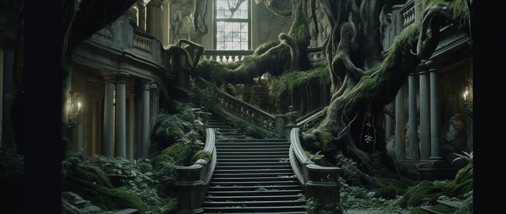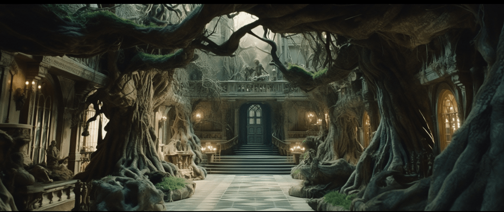 The inside of the mansion looks like this: a series of partly re-created movie sets from the fantasy film that made the director’s fortune. It’s insanely cool.
